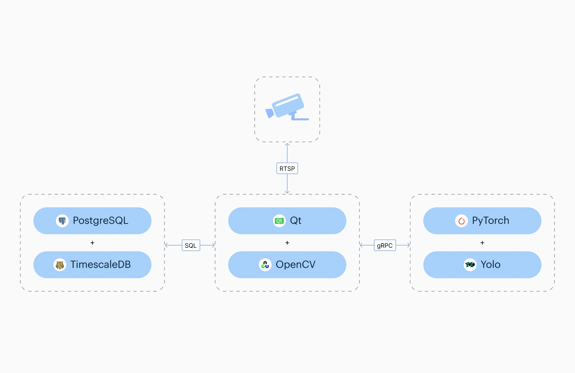 The system is based on a neural network developed in PyTorch and Ultralytics YOLO for fast and accurate object detection. The interface is implemented using Qt and JavaScript. Components are integrated via a RESTful API, while controller management is implemented in C++ using Rapid STP.