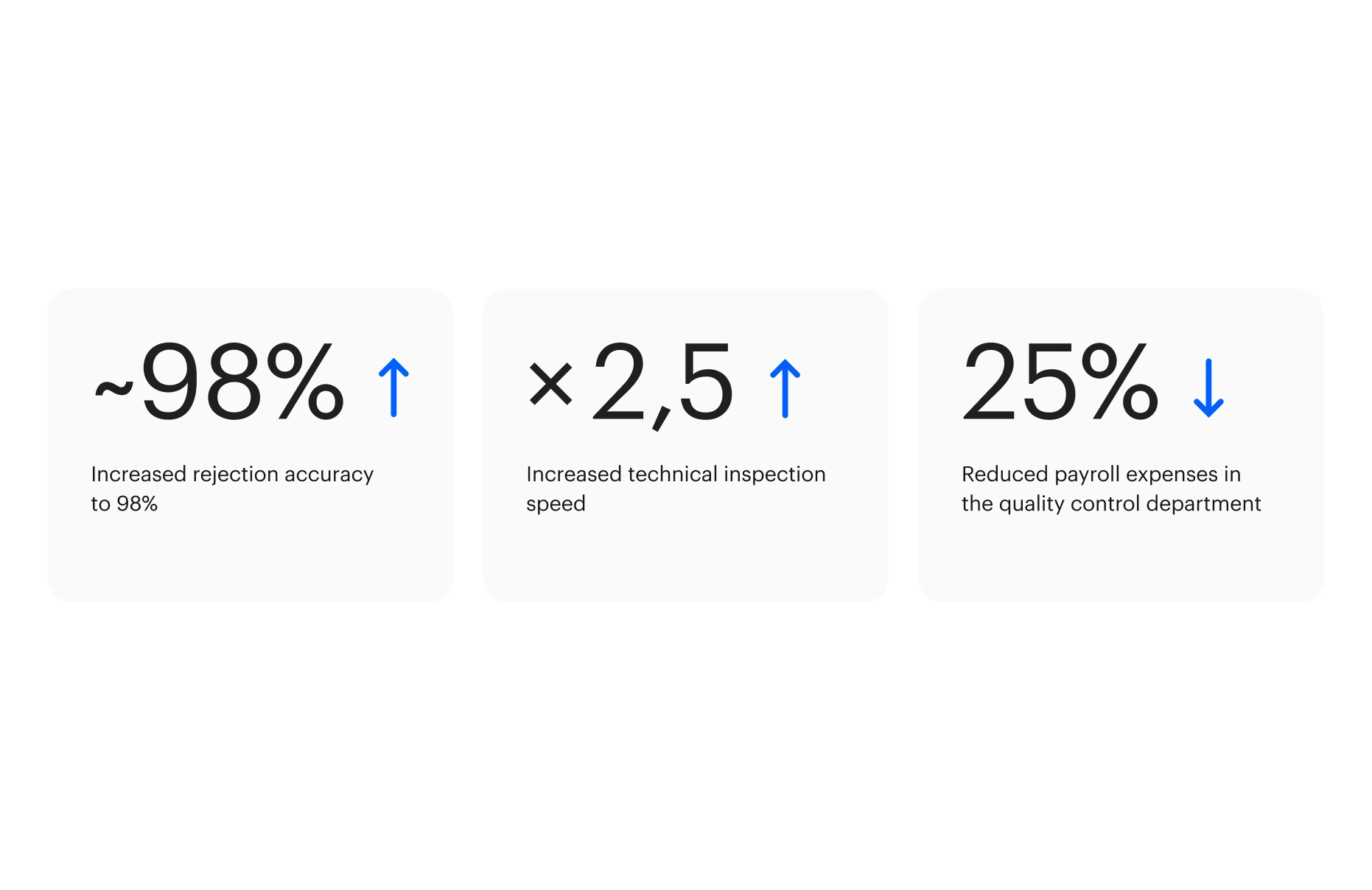 Approximately 98% defect detection accuracy, improving process stability. 2.5× faster inspections through workflow optimization and automated analysis. 25% lower payroll costs as automation reduced labor expenses while maintaining efficiency.
